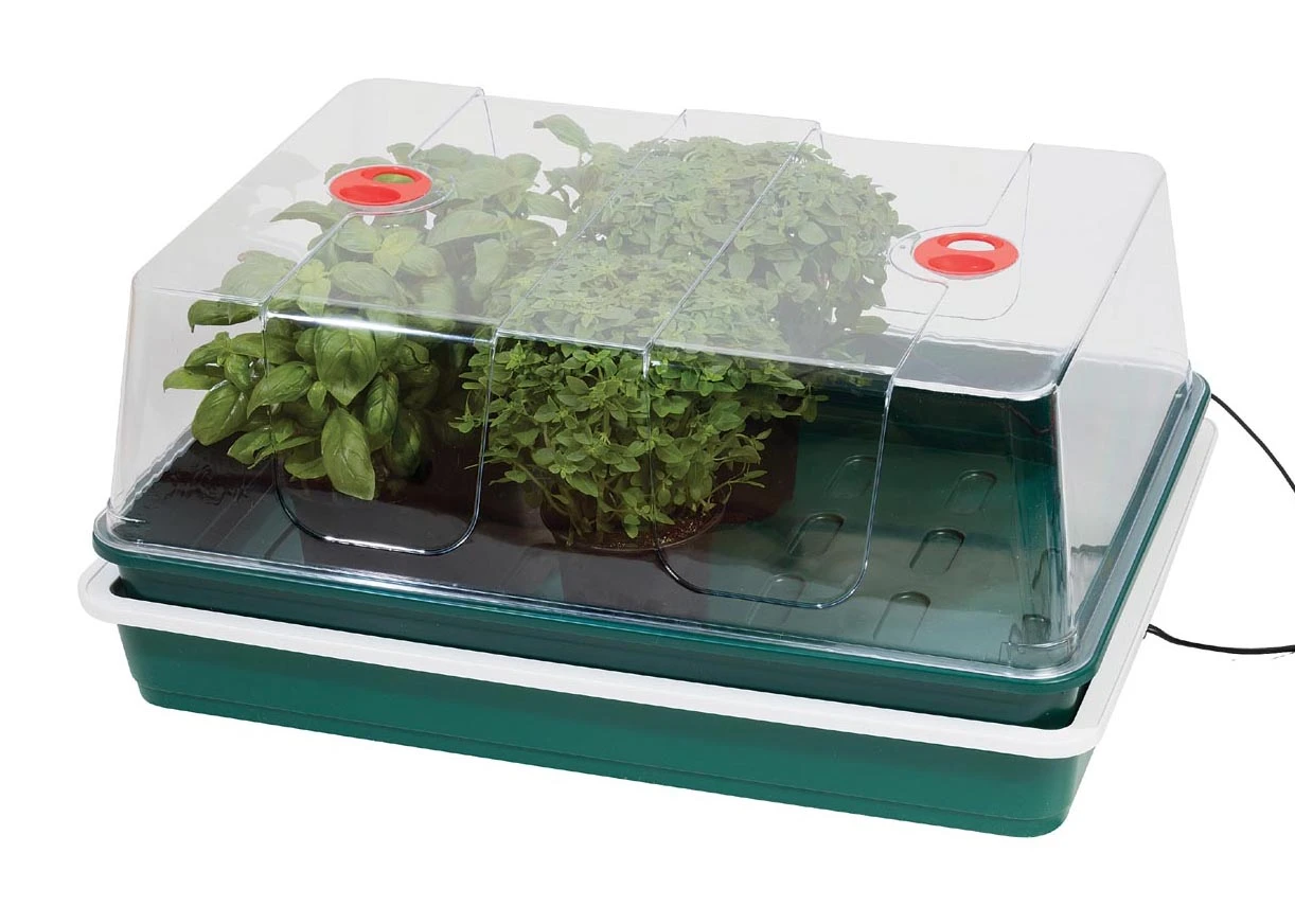 Das beheizter XL-Gewächshaus von Garland, ist für alle Standard Anzuchttöpfe geeignet. Dank des beheizten Bodens, der mit einem digitalen Thermostat ausgestattet ist, lässt sich die Temperatur im XL-Vermehrer perfekt zwischen 5°C und 30°C einstellen. Der Deckel ist mit zwei Lüftungsöffnungen ausgestattet, die geöffnet und geschlossen werden können. Das ist sehr wichtig, denn Setzlinge und Stecklinge brauchen eine konstante Luftfeuchtigkeit von etwa 60-80 % und eine Temperatur von 20-25 °C. Der GARLAND G193 besteht aus dem bereits bekannten Garland XL High Dome Propagator und dem neu entwickelten beheizten Boden mit digitaler Temperaturkontrolle. Der beheizte Garland XL Propagator ist 58 cm lang, 40 cm breit und 26,5 cm hoch. Dank des extra hohen Deckels bietet der Garland Heated XL Propagator mehr als genug Platz für die Keimung von Setzlingen, die Bewurzelung von Stecklingen oder die Vorzucht Ihrer Pflanze.
