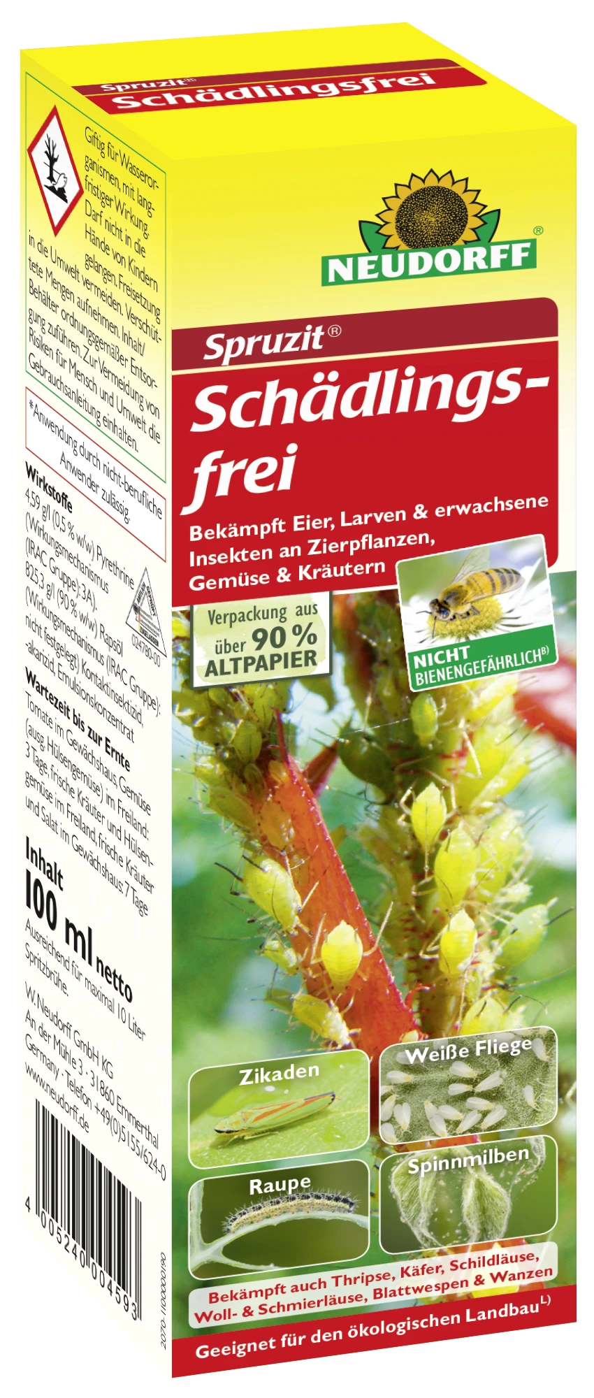 Spritzmittel mit breitem Wirkungsspektrum gegen saugende Insekten an Zierpflanzen, Obst und Gemüse. Durch die Kombination der natürlichen Wirkstoffe Natur-Pyrethrum und Rapsöl werden nicht nur ausgewachsene Insekten, sondern auch deren Eier sicher bekämpft. Nebenwirkungen auch gegen Raupen, Blattwespen- und Käferlarven. Nicht bienengefährlich (NB 6641). Zugelassen für den ökologischen Landbau, lt. EG-Verordnung.