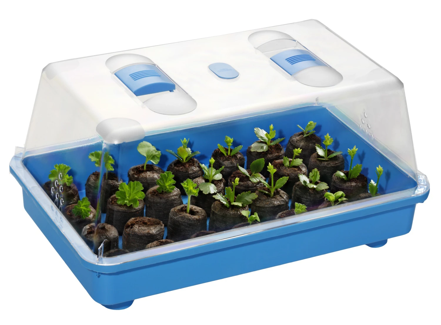 Mit der glasklaren Haube bietet Marco Color ideale Bedingungen auch auf kleinstem Raum. Der Belüftungsregler in der Haube sorgt zusammen mit den seitlichen für das ideale Wachstums-Klima. Mit 28 Vertiefungen im Boden und Rinnen für eine optimale Wasserverteilung sind die bunten Zimmergewächshäuser ideal für die Verwendung mit den Romberg Kokos-Quelltabletten. Aber auch in Kombination mit den neuen torfreduzierten Anzuchttöpfen kommen die bunten auf der Fensterbank groß raus.