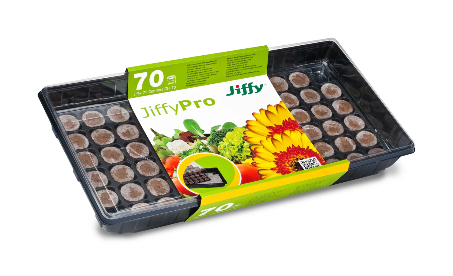 Großes Gewächshaus mit 70x Jiffy-7®, Dochtmatte und extra großer Wasserkapazität, 54 x 28 x 8 cm (BxTxH), Schale mit Kuppel mit 70 Jiffy-7® Torfpellets. Die extra tiefen Wasserkanäle und die Dochtmatte mit hoher Kapazität ermöglichen längere Pflegeintervalle. Ideale Bedingungen für die Anzucht.